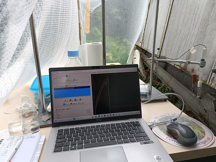 The materials studied were identified (unalloyed aluminium or aluminium-magnesium alloy) despite difficult conditions: unexpected showers that forced us to hastily protect the measurement zones, maintenance work around the sites by the teams in charge, polluting the measurement zones, and adaptation of our schedule to that of our partners, facilitating our daily access to the sites via equipment made available (scaffolding).